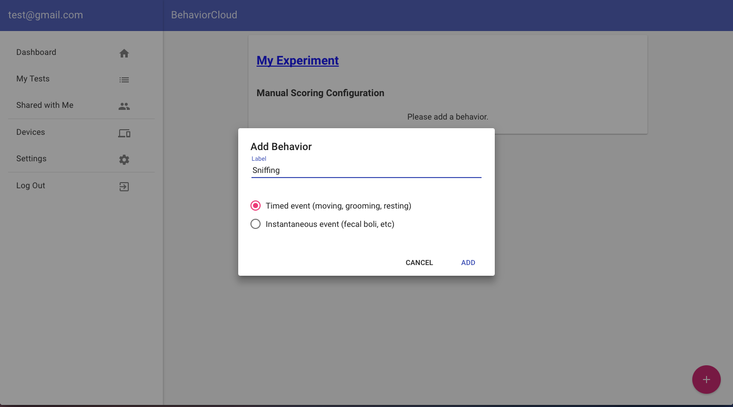 In your experiment dashboard, click Manual Scoring Configuration to set up the behaviors to be scored. Add behaviors one at a time by clicking the add icon at the bottom right, entering a label for the behavior, and selecting whether the event is timed or instantaneous. Timed events are those behaviors that have a duration, like walking or eating. Instantaneous events are those behaviors that are counted, like fecal boli.